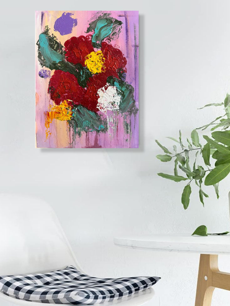 Painted with a palette knife in thick, expressive strokes, this floral abstraction is less about botany and more about feeling. The blossoms bleed into a dreamy lilac haze, their colors raw and unfiltered—deep crimson like longing, white like silence, gold like something once cherished but fading.
